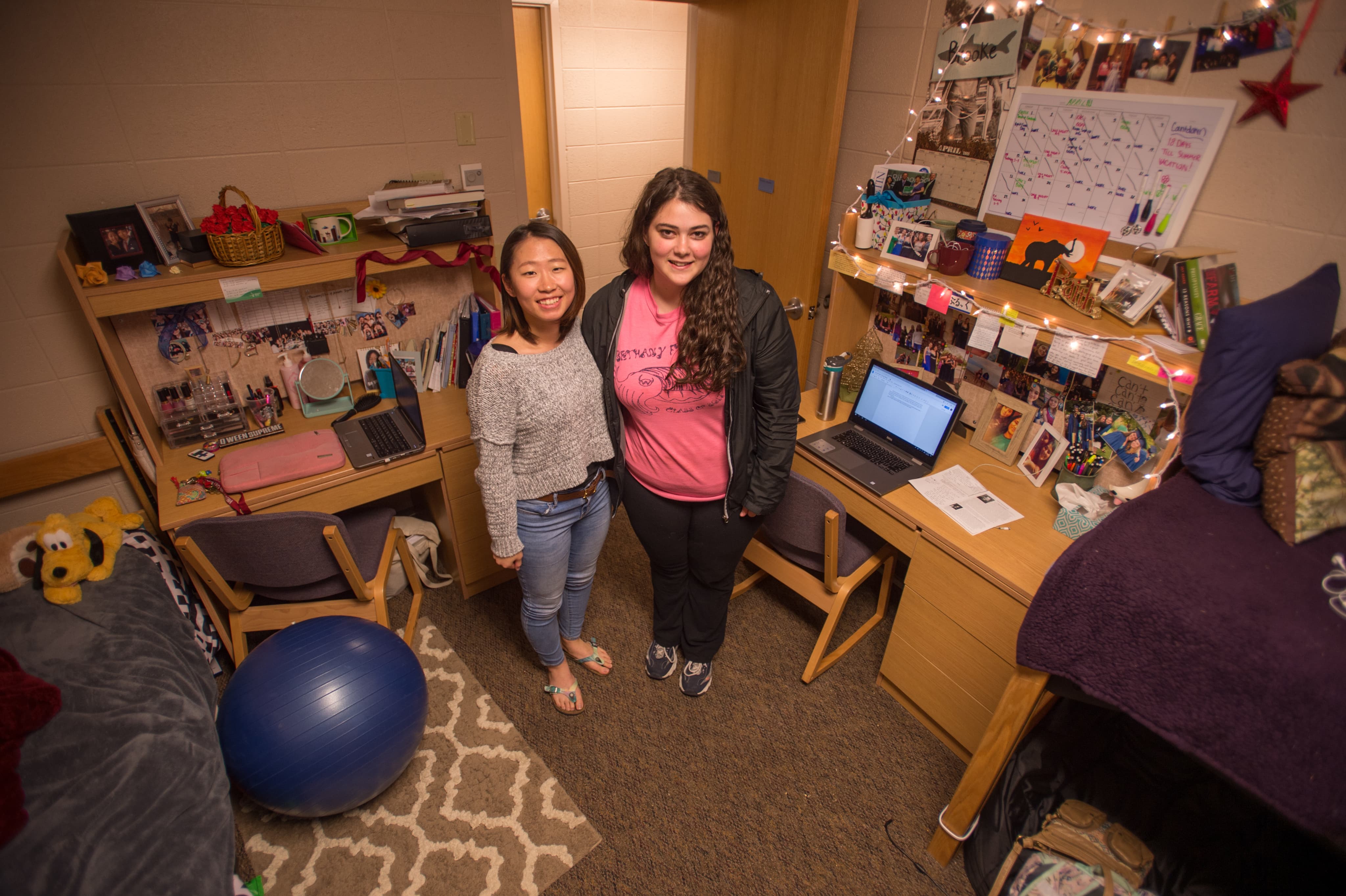 Each residence hall room is furnished with the following items for each student: bed, mattress, dresser, mirror, desk, chair, desk lamp, bulletin board, blinds and wireless access to the campus network.